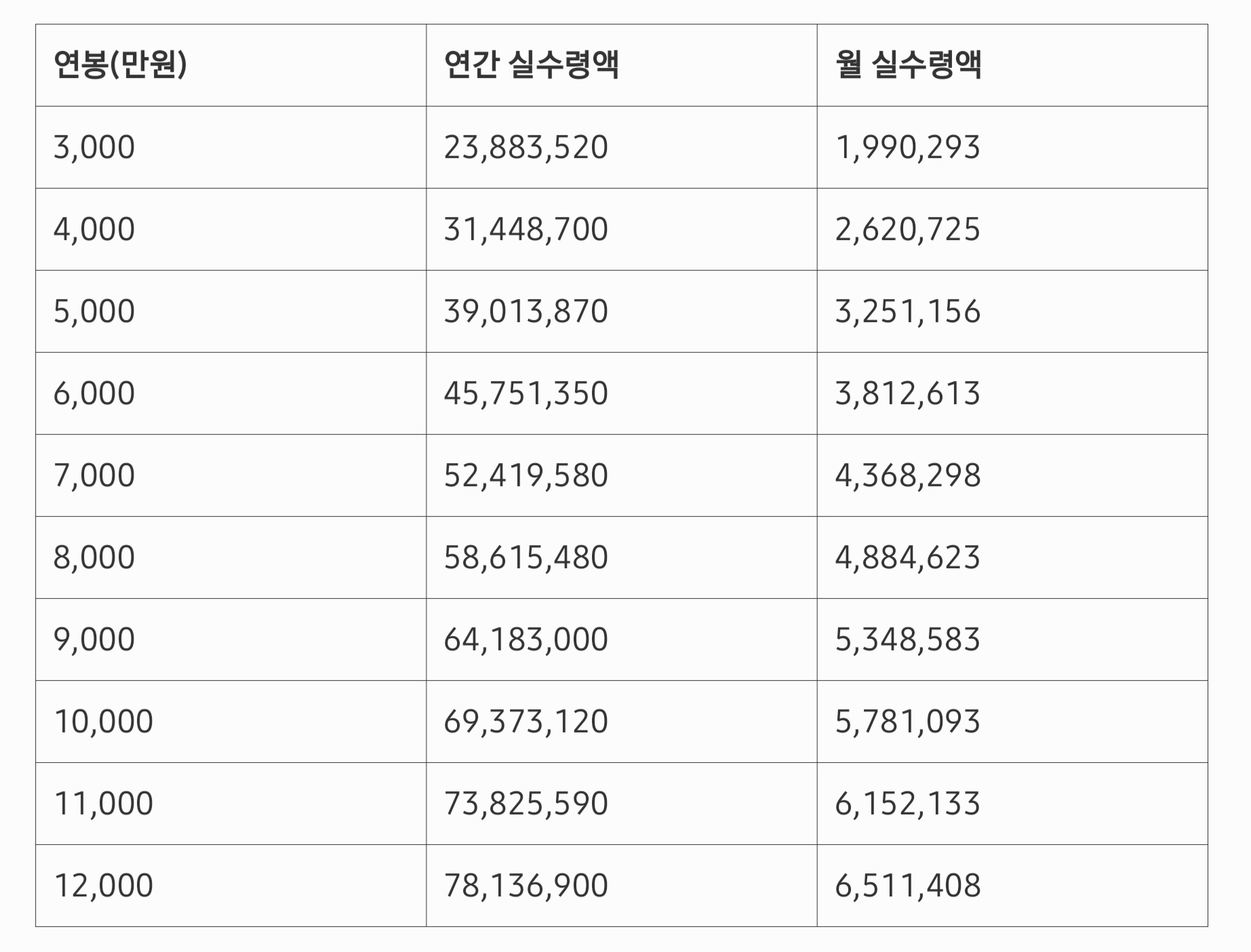 위 공제 항목을 반영해서 연봉별 실수령액을 계산했어요.